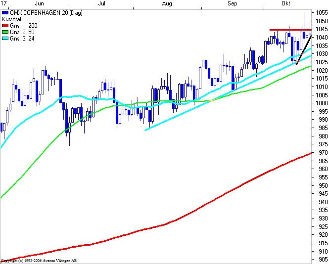 Ser BørsUdsigten på dagschartet for C20 (1.042), er der tale om en test af den stigende trendlinie i 1.042. Et brud vil udløse et salgssignal. Brud af 1.044 niveauet bekræfter købesignalet.