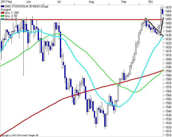 Ser BørsUdsigten på S30 indekset (1638), er der tale om en opbremsning efter det stærke købesignal ved bruddet af 1.654 niveauet. Ofte ser vi en test af et stærkt modstandsniveau før en ny optur – så opbremsningen er ikke unormal. Bekræftelse af tertiært købesignal ved brud af 1.670 niveauet. Tertiært /sekundært salgssignal udløses ved brud af 1.654 niveauet.