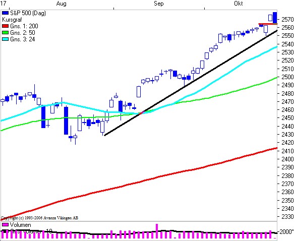 Ser BørsUdsigten på dagschartet for S&P500 (2.565), ligner det en midlertidig top på vores candlelightsignal i for af en ”omsluttende” (engulfing) revesal. Det betyder opbremsning / lukning ”break away gap”, og dermed et spekulativt salgssignal. Tertiært – sekundært salgssignal udløses bekræftet ved brud af 2.558 niveauet. Brud af 2.550 vil betyde starten på en negativ trend.
