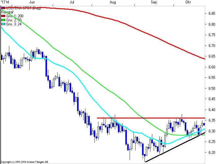Ser BørsUdsigten på dagschartet for valutakrydset USD/DKK (6,329), er der tale om en sekundær kileformation. Spekulativt salgssignal ved brud af 6,32 niveauet, og sekundært salgssignal ved brud af 6,29 niveauet.
