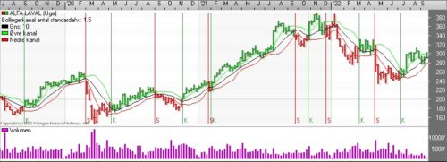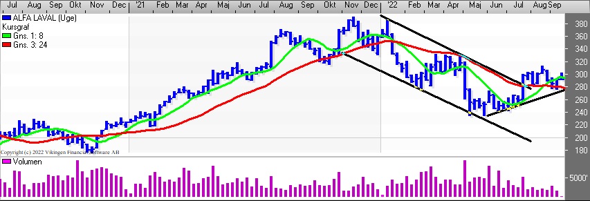 Aktiekursen på Alfa Laval var i maj nede og teste niveauet 235 og siden er aktien handlet op i niveauet 310, hvor modstandsniveauet ikke kunne brydes og aktien er handlet ned i 280.