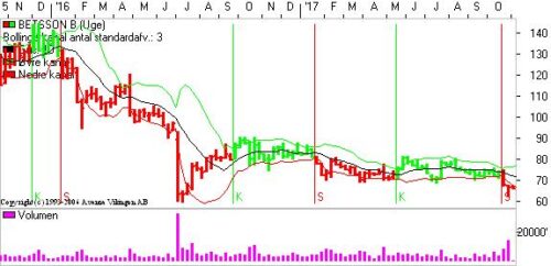 Betsson går i den forkerte retning og faldet i aktien betyder, at konsolidering i aktien er brudt og det har givet et salgssignal i flere modeller på ugebasis. Med faldet er støtteniveauet ved kurs 70 brudt og nærmeste støtteniveau er ved 60.