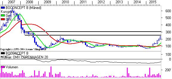 Det danske boligindretningsselskab fortsætter den stigende tendens, der blev etableret i februar/marts i år. Dengang lå aktien i niveauet 90, og i dag handles aktien i niveauet 240. Aktien er i år steget med 240 pct.