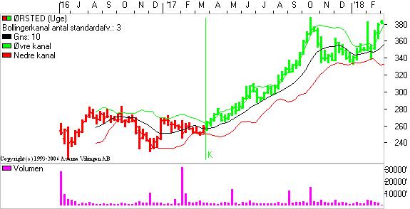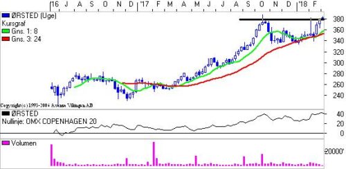 Ørsted tester nu modstandsniveauet 380-385 for 3. gang på et ½ år. Der har været en positiv tendens i kursudviklingen siden foråret 2017, dengang blev aktien handlet i niveauet 260 mod dagens kurs på 380,60.