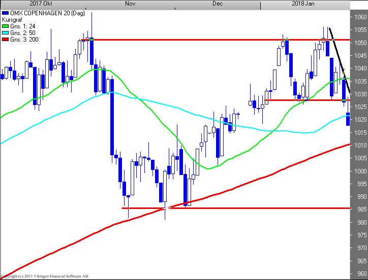 Ser BørsUdsigten på dagschartet for C20 (1.018), er der tale om et stærkt salgssignal efter udbruddet af basen med bundlinien i 1.028. Positioner indgået på støttelinien solgt ved bruddet af 1.025 niveauet. Indikerer en god mulighed for en ny test af 995 niveauet – såfremt Novo Nordisk skuffer.