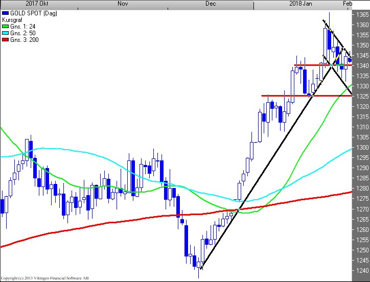 Ser BørsUdsigten på dagschartet for guld (1.342) tester guldprisen den gamle støtte nu modstand i 1.343-45 niveauet, hvilket er helt normalt. Der er fortsat tale om en optrend, selvom hældningskoefficienten er aftagende.