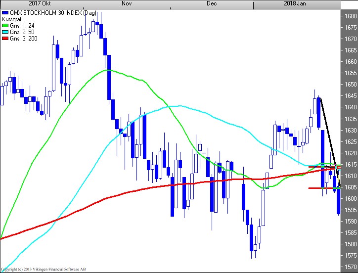 Ser BørsUdsigten på S30 indekset 1.593 (minus 0,6 pct. (10,16 point), er den negative trend blevet genoptaget. Den langsigtede trend er nu negativ, og der er ved at blive udløst ”Death Cross” på de glidende gennemsnit BørsUdsigten benytter. Både det 24 dages og det 50 dages glidende gennemsnit er ved at bryde det 200 dages glidende gennemsnit ovenfra – hvilket er et rent salgssignal.