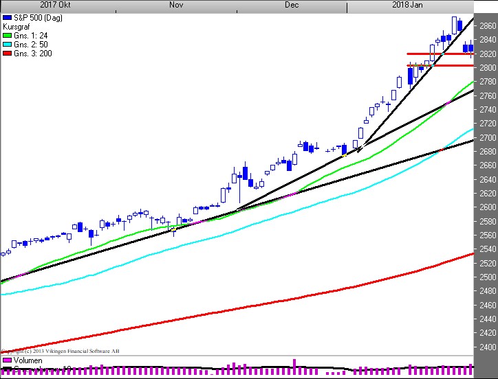 Fundamentalt vurderer BørsUdsigten, at der fortsat er grundlag for stigninger på grund af den amerikanske skattereform. Der skal blot samles kræfter i en konsolidering før, der er ny styrke til et angreb på 2.870 og efterfølgende 3.000 niveauet.