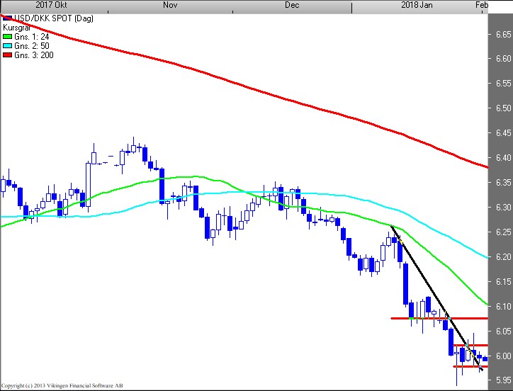 Ser BørsUdsigten på dagschartet for valutakrydset USD/DKK (6,0), er der fortsat tale om en konsolidering – og en mulig bundformation. Vær opmærksom på at brud støtteniveauet i 5,98 niveauet (bekræftet) vil udløse nyt salgssignal, og genoptagelse af den accelererende nedtrend. BørsUdsigten noterer at presset fortsat er fra oven (faldende højeste). Toplinien i den spekulative konsolidering ligger i 6,02 niveauet.