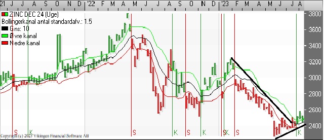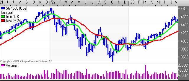På ugebasis er der etableret et købssignal i både Bollingerkanalen og kursgrafen. Bollingerkanalen har været i køb i 6 uger. De glidende gennemsnit på 8 og 24 uger har etableret et Golden Cross i denne uge.