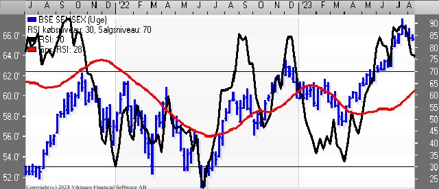 BSE Sensex (det indiske indeks) er faldet tilbage og nærmest med støtte i niveauet 65.000 og herefter i niveauet 64.000 mens der er modstand i niveauet 67.000 og herefter i niveauet 68.000.
