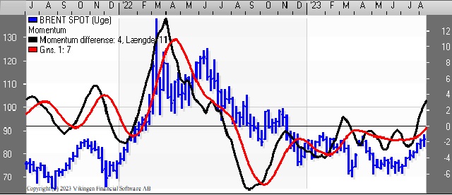 Brent Spot fortsætter den stigende tendens. Der er købssignal i både kursgrafen og Bollingerkanalen på dags- og ugebasis. Stigningen trækker op i de tre indikationsmodeller på ugebasis. RSI er over 80. Nærmeste modstandsniveau er ved 88 som er blevet testet i januar og april. Der er støtte i niveauet 84 og herefter i niveauet 82-83.