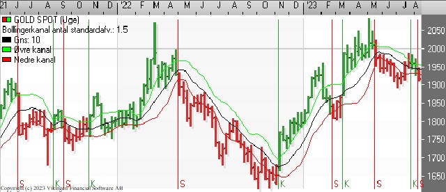 Guldet falder tilbage og salgssignalerne på dagsniveauet er nu blevet bekræftet af salgssignal på ugebasis i blandt andet Bollingerkanalen. Faldet trækker ned i de tre indikationsmodeller. RSI er i niveauet 40-41.