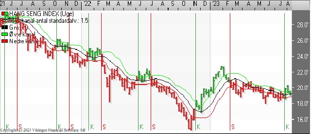 Hang Seng er faldet tilbage i ugens løb fra 20.300 til 19.000 grundet et større fald i industriproduktionen end ventet. RSI er fortsat over 50. Momentum er i en stigende tendens og ligger over det glidende gennemsnit, hvilket giver et positivt signal i indekset.