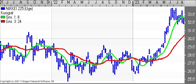 Nikkei har i ugens løb været nede og teste støtteniveauet 32.000. Den faldende tendens har trukket ned i de tre indikationsmodeller på ugebasis. RSI er under 60. Momentum er brudt igennem det glidende gennemsnit oppefra. Nærmeste støtteniveau er ved 32.000 og herefter i niveauet 31.000, mens der er modstand i niveauet 34.000 og herefter i niveauet 35.000.