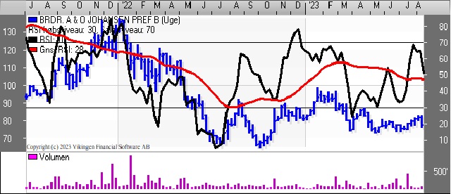 Brdr. A&O Johansens aktie bevæger sig vandret i niveauet 75-85. På dagsniveauet er de glidende gennemsnit på 8 og 24 dage blevet brudt oppefra. Bollingerkanalen er gået i salg for 3 dage siden.