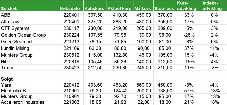Den nordiske portefølje har år til dato givet et afkast på 4,2 pct. mod OMX Nordic 40-indekset som har givet et afkast på 6,9 pct. På salgslisten er Golden Ocean Group, Grieg Seafood og Nibe.