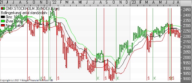 OMX Stockholm 30 fortsætter den faldende tendens og salgssignalerne er fortsat intakte. På ugebasis er der salgssignal i Bollingerkanalen og de glidende gennemsnit er blevet brudt oppefra og vil i løbet af 2-3 dage etablerede et Death Cross.
