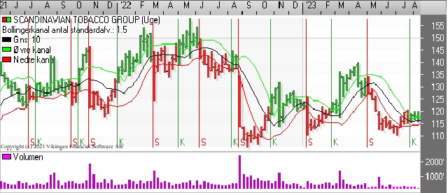 Scandinavian Tobacco Group (STG) handles i niveauet 115-120. Aktien toppede i april i niveauet 140. På dagsniveauet har de glidende gennemsnit på 8 og 24 dage etableret et Golden Cross i begyndelsen af juli. Bollingerkanalen etablerede et nyt købssignal i slutningen af juli.