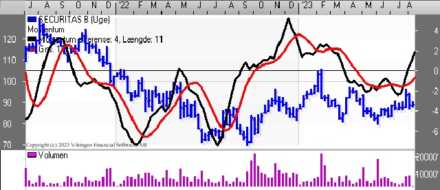 Securitas med nyt signal på ugebasis. På dagsniveauet er der igen etableret salgssignal i både Bollingerkanalen og de glidende gennemsnit har netop etableret et Death Cross.
