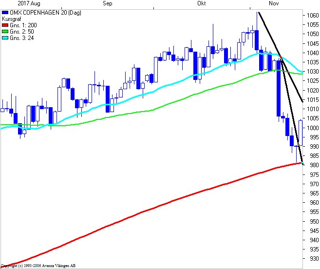 Tertiært / spekulativt (kort sigt) har BørsUdsigten genkøbt en lang position ved bruddet af 991 niveauet (solgt i 1.050 niveauet). Endvidere er des spekulative shortposition blevet lukket i 991niveauet – åbnet i 1.035 niveauet. Stop loss og åbning af ny spekulativ short ved brud af 990 niveauet. Strategi: Køb. (ændret)
