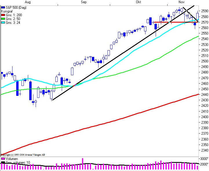 Ser BørsUdsigten på dagschartet for S&P500 (2.586), fik vi en test / salgssignal onsdag af bundlinien i 2.570 niveauet. Der er tale om et kritisk niveau.