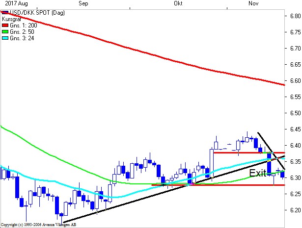 EXIT og terminssikring af alle USD-positioner ved bruddet af 6,36 niveauet. Hvis de ikke er lukket brug en bounce til at åbne på!