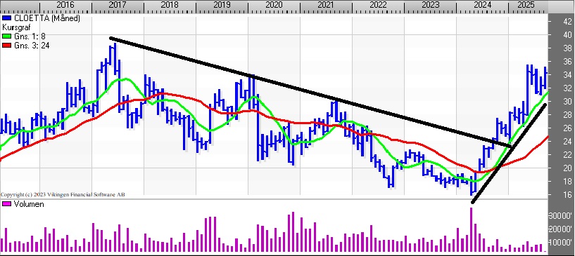 På ugebasis har kursgrafen været i køb siden juni 2024. Støtteniveauet var under pres i januar 2025 i niveauet 24, men overlevede og fortsatte den stigende tendens.