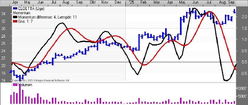 Bollingerkanalen har netop etableret et nyt købssignal efter 9 uger i salg. Stigningen i aktiekursen har trukket RSI og Momentum op på ugebasis. RSI er over 50 efter at være kommet nede fra 40. Momentum er brudt igennem det glidende gennemsnit nedefra.