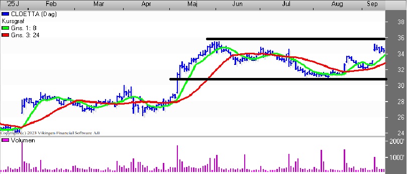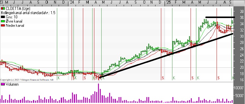 Teknisk handles aktien vandret i niveauet 31-35, og det har stået på siden maj. Der blev etableret et købssignal i midten af august i kursgrafen, hvor de glidende gennemsnit på 8 og 24 dage har dannet et Golden Cross. Bollingerkanalen etablerede et nyt købssignal for 6 dage siden.