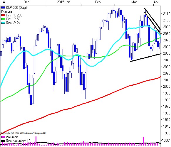 Ser BørsUdsigten på dagschartet for S&P500 (2.081), konsoliderer indekset sig sidelæns i en kile. Toplinien ligger i 2.080 niveauet og bundlinien i 2.050 niveauet. Der er ingen afklaring på den kommende trend.