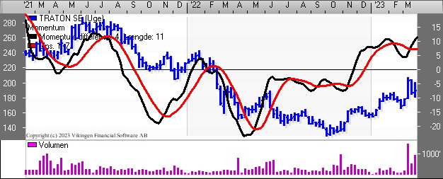 Det kører stille og roligt for Traton i en stigende trendkanal. Traton producerer og sælger MAN, Navistar, VW og Scania lastvogne og busser.