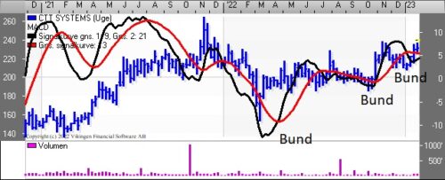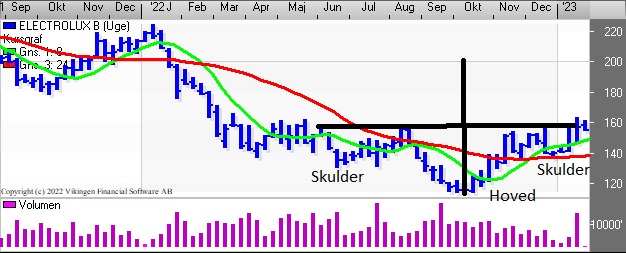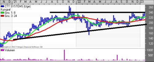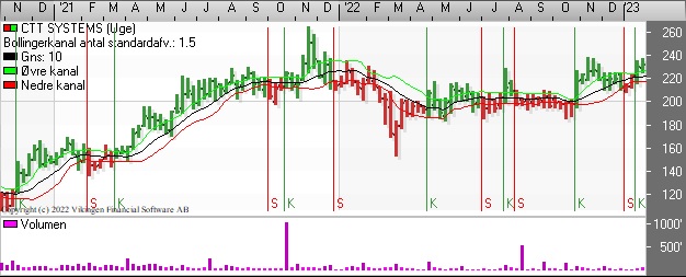Teknisk har aktien bevæget sig vandret i niveauet 185-230 i det meste af 2022 (med undtagelse af marts, hvor kursen var i 155). Ved årsskiftet etablerede aktien en bund i niveauet 210 og nu handles aktien i niveauet 230.