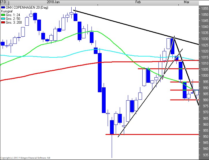 Tertiært / spekulativt (kort sigt) har BørsUdsigten genkøbt en lang position og lukket en short ved bruddet af 985 niveauet. Stop loss og åbning af short ved brud af 980 niveauet. Strategi: Køb.