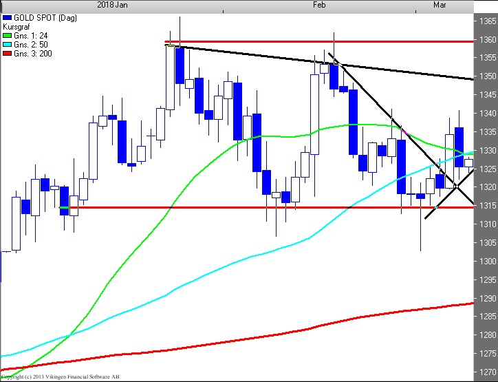 Bemærk! Der kan fortsat være tale om en mulig shs-formation / dobbelt top. Brud af ”neckline” 1.315 niveauet er EXIT af alle guldpositioner.