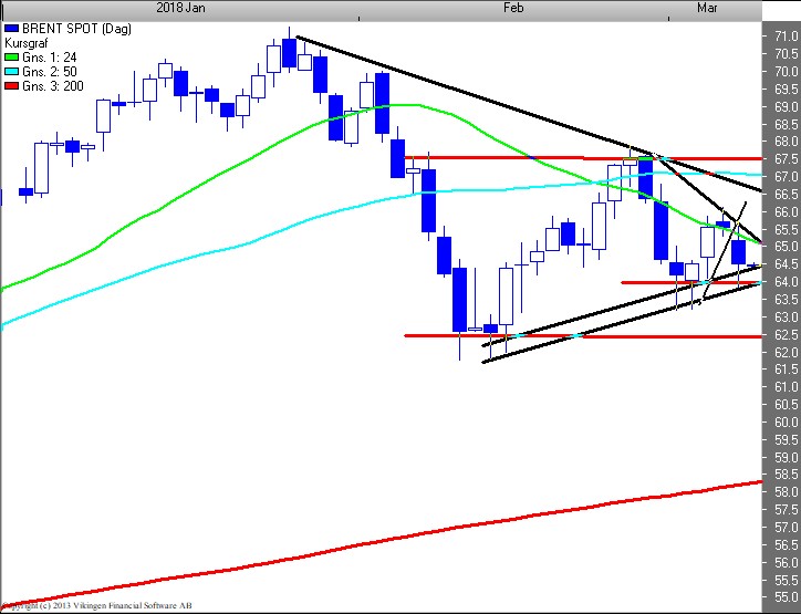Ser BørsUdsigten på dagschartet for UK Brentkvaliteten (61,6), er der udløst spekulativt salgssignal ved brud af 65,4 niveauet. Støtte i den horisontale støttelinie i 64 niveauet. Sekundært er der tale om en kileformation med en toplinie i 66,5 niveauet og en bundlinie i 64,5 niveauet. Brydes den sekundære horisontale støtte i 62,5 niveauet, er der tale om en sekundær bekræftet nedtrend, og dermed et EXIT signal. Der er også gode muligheder for en bundformation i form af et W-formation.