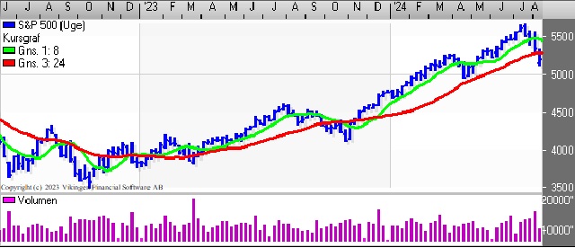 S&P 500 har etableret et salgssignal på dagsniveauet i både Bollingerkanalen og kursgrafen. På ugebasis er der ligeledes salgssignal i både kursgrafen og Bollingerkanalen. Der er en faldende tendens i de tre indikationsmodeller på ugebasis. RSI har ramt 55, og Momentum er brudt igennem det glidende gennemsnit oppefra.