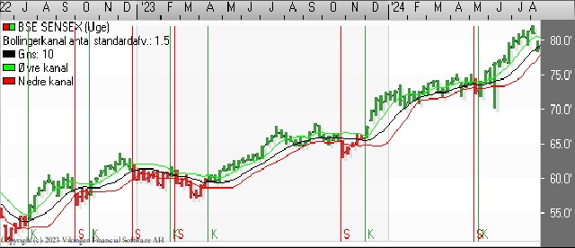 BSE Sensex faldt tilbage i sidste uge, men overordnet holder indekset fast i den stigende tendens, og der er fortsat købssignal i både Bollingerkanalen og kursgrafen.