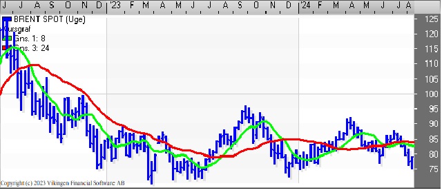 Brent-olie: For tre dage siden ramte Brent-olie niveauet 75, men den handles nu oppe omkring 78. Der er salgssignal i alle modellerne på både dags- og ugeniveau. De tre indikationsmodeller er i en stigende tendens på ugebasis. RSI har nået 40. Momentum er svagt stigende, mens MACD er i en faldende tendens og under middelværdien på 0.