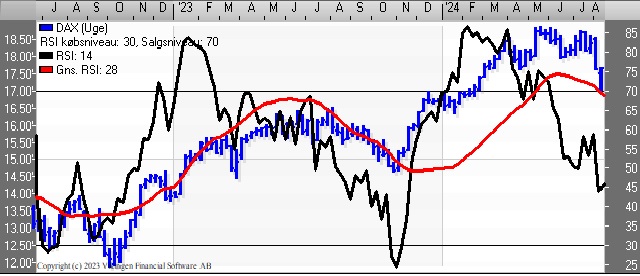 De tre indikationsmodeller har alle etableret en topformation. RSI er faldet og er nu under 70. Momentum er faldende, men har endnu ikke brudt igennem det glidende gennemsnit oppefra.