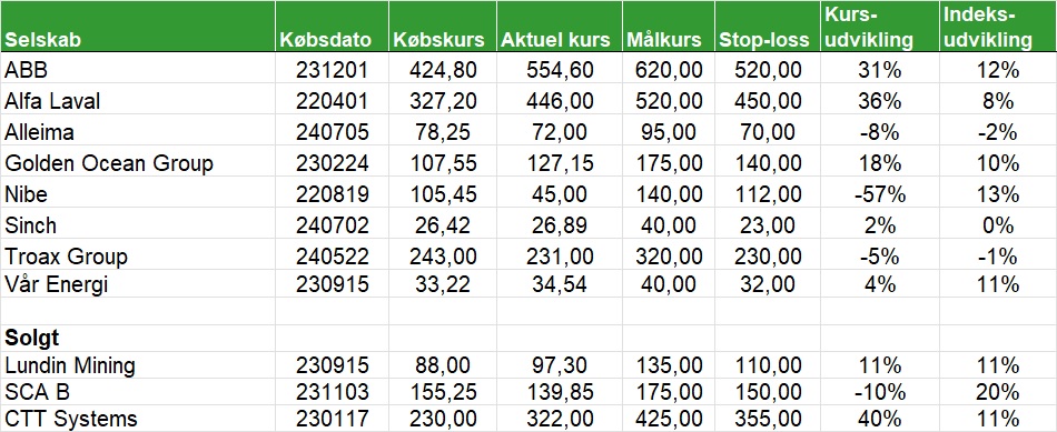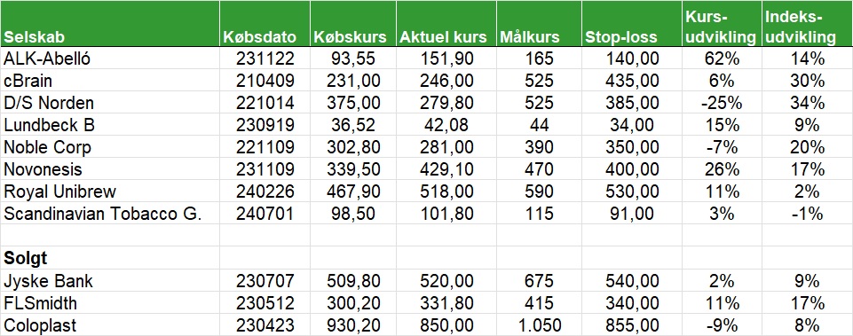 Den danske portefølje har år til dato givet et afkast på 8,5 pct. mod C25-indekset, som har givet et afkast på 6,8 pct. Sælger Jyske Bank. På salgslisten er cBrain, D/S Norden, Noble og Royal Unibrew.