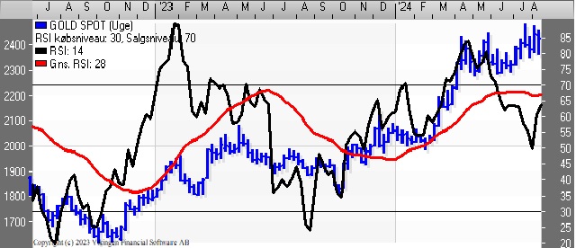 Guldet har to gange på en måned testet modstandsniveauet 2480, men det er ikke brudt igennem og er i stedet faldet tilbage til niveauet omkring 2380. På dagsniveauet er der salgssignal i Bollingerkanalen, mens kursgrafen fortsat viser købssignal. På ugebasis er der købssignal i både Bollingerkanalen og kursgrafen. Det er vigtigt at holde øje med niveauerne.