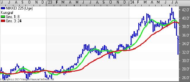 Der har den seneste måned været et fald på 10.000 point i det japanske indeks. Det betyder, at der er salgssignal i alle modeller på ugebasis. Indekset var nede og testede niveauet 32.000, men er nu handlet op til niveauet 35.000.