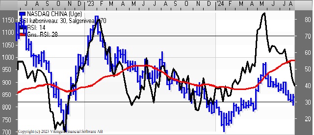 Nasdaq China indekset er fortsat i en faldende tendens, og der er salgssignal i modellerne både på dags- og ugeniveau. Der er en faldende tendens i de tre indikationsmodeller på ugebasis. RSI er under 40, og Momentum er brudt igennem det glidende gennemsnit oppefra.