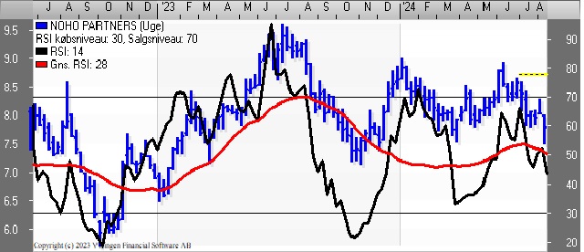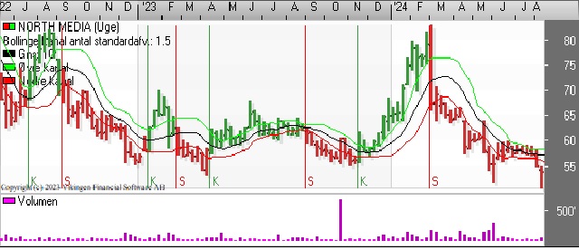 Mandag var der fald over hele linjen, dog ikke for Skako, som søndag aften meddelte, at man havde modtaget en stor ordre fra en kunde i Marokko. Aktien er i år faldet med 25 %, da man har solgt Skako Concrete til Zefyr Invest og udbetalt pengene til aktionærerne, hvilket fik aktien til at falde tilbage. Mandagens stigning på 12 % betyder, at der er etableret købssignal på ugebasis i Bollingerkanalen. Stigningen i aktiekursen har sendt RSI op til 45. Aktien ser interessant ud på dette niveau.