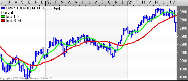OMX Stockholm 30 er gået i salg både på dags- og ugeniveau i alle modeller. De glidende gennemsnit på 8 og 24 uger har i denne uge etableret et Death Cross. RSI er under 40, og Momentum er i en faldende tendens.