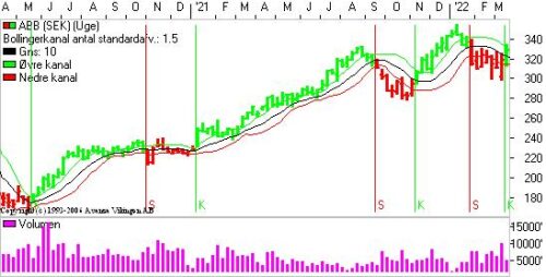ABB toppede i begyndelsen af januar i niveauet 350 og ramte niveauet 300 i slutningen af februar og marts og blev fredag handlet i 320 – 321. Der er etableret nye købssignaler på dagsniveauet i Bollingerkanalen og de glidende gennemsnit. På ugebasis har Bollingerkanalen ligeledes etableret et købssignal, men de glidende gennemsnit er lige ved at etablere et ”Death Cross”.