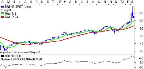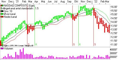 På dagsniveauet er der etableret et købssignal i Bollingerkanalen og de glidende gennemsnit er blevet brudt nedefra og holder tendensen, bliver det til et ”Golden Cross” i løbet af 4-6 dage. På ugebasis er der fortsat salgssignal i de to signalmodeller: Bollinger og Parabolic. De glidende gennemsnit på 8 og 24 uger er endnu ikke brudt nedefra. Der er divergens mellem de tre indikationsmodeller på ugebasis. RSI har ramt 38 og MACD er fortsat under 0.