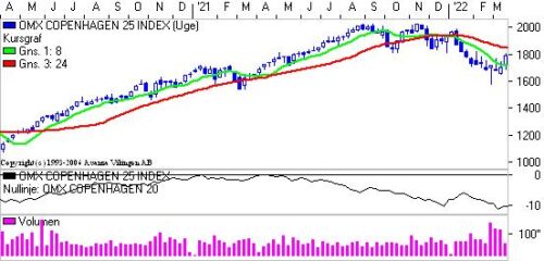 På ugebasis er nærmeste støtteniveau ved 1600 og herefter i niveauet 1650, mens der er modstand i niveauet 1800 og herefter i niveauet 1850.