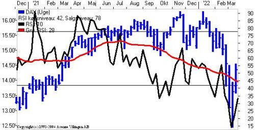 Den begyndende positive tendens kan dog ses i RSI, som etablerede en bund i sidste uge i niveauet under 10 og torsdag ramte modellen 32. Den samme positive tendens kan endnu ikke ses i Momentum på ugebasis, som fortsat er i en faldende tendens.